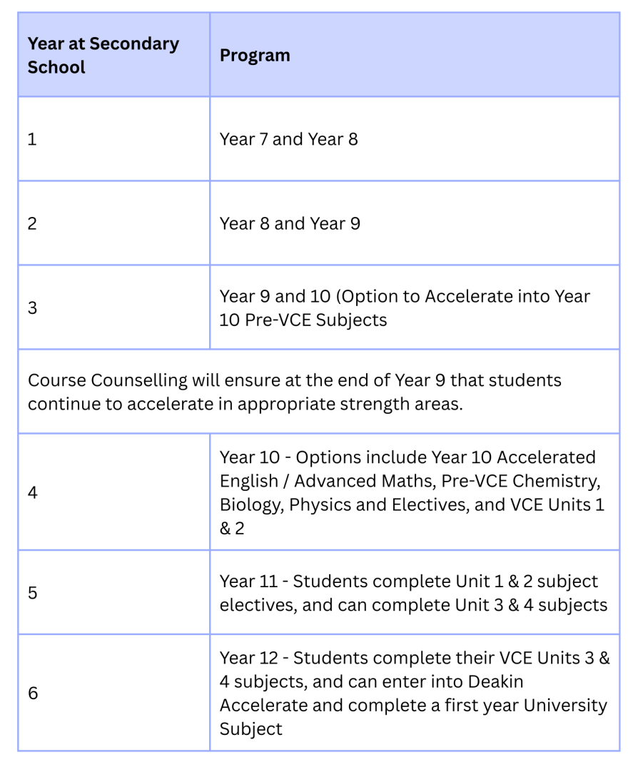 Accelerated Learning Programs are not for all students and whilst they can be rewarding, they can also be challenging as students will be expected to be self-motivated and independent learners. Two key parts of the program will be increased workload and faster curriculum coverage in the early years of secondary school and students must be prepared to engage positively with this extra challenge. It is also worth noting that due to the different curriculum structure it is not possible to change from the accelerated program back into mainstream classes. It is a big commitment, and families should note that if they accept a place in the programme they will stay in that class for core subjects from Year 7 to Year 9. Electives across each of these years will remain mixed with the rest of the cohort.