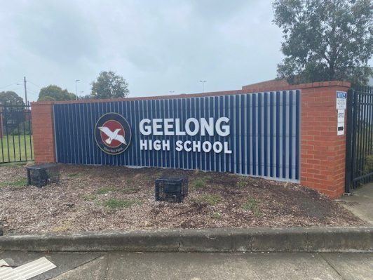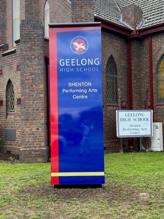 - Shenton Performing Arts Centre corner. Replacing the terribly old Geelong High School wooden sign that had been in place since the school purchased the property in 1994 (can be seen in the background of the image below – soon before removal).