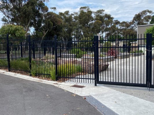 - The old and dilapidated boundary fencing along the Ryrie Street frontage (east of the front entrance), and the entire eastern boundary bordering Eastern Park will be replaced with black palisade style fencing, matching what was installed around our Sensory Garden when the schools rebuild was concluded in 2020….see image below.