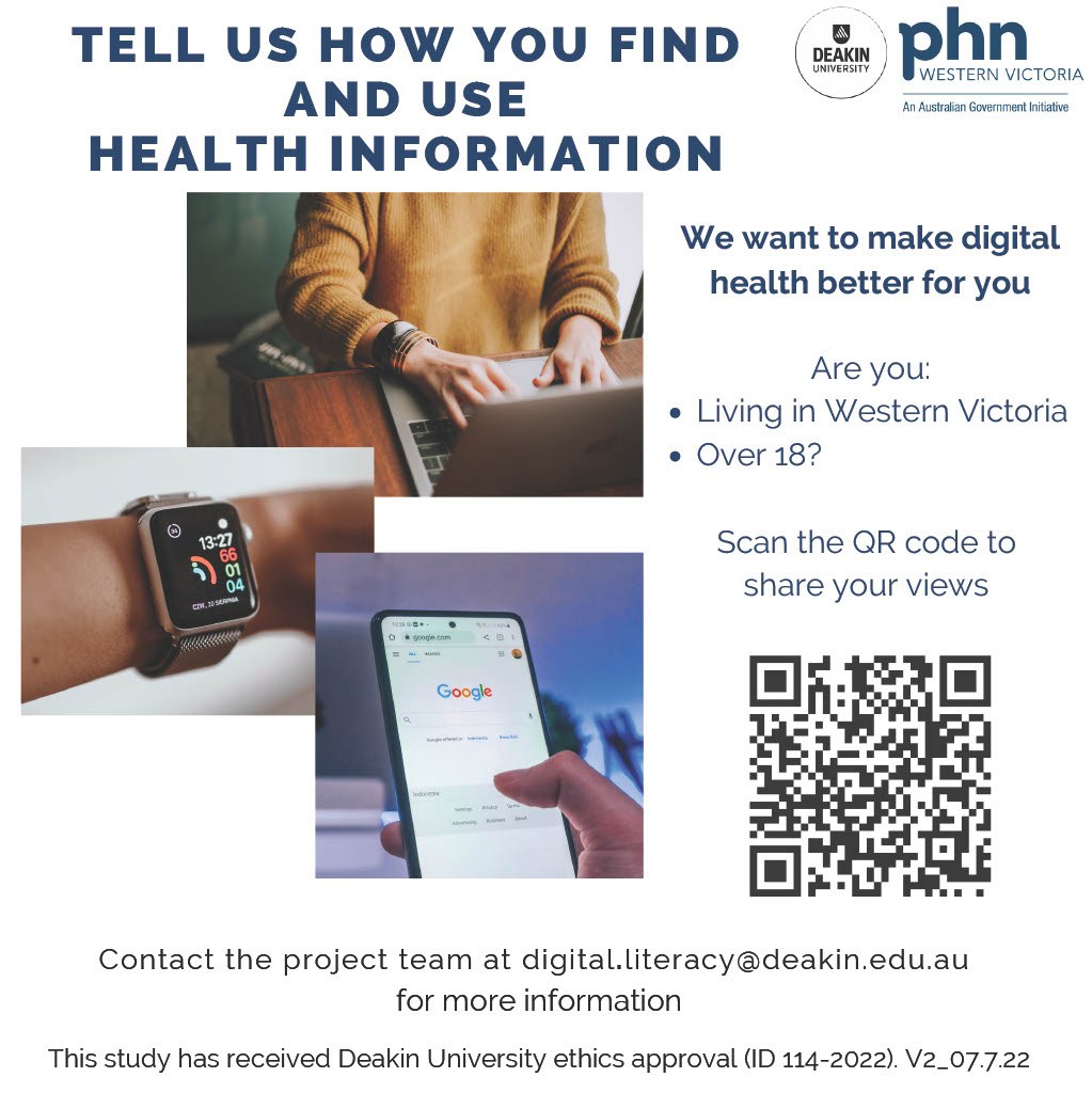 The Digital Health team at Western Victoria Primary Health Network are working with Deakin University to consult with our communities to look at how we can support the meaningful use of digital health, and improve access to health information and healthcare.