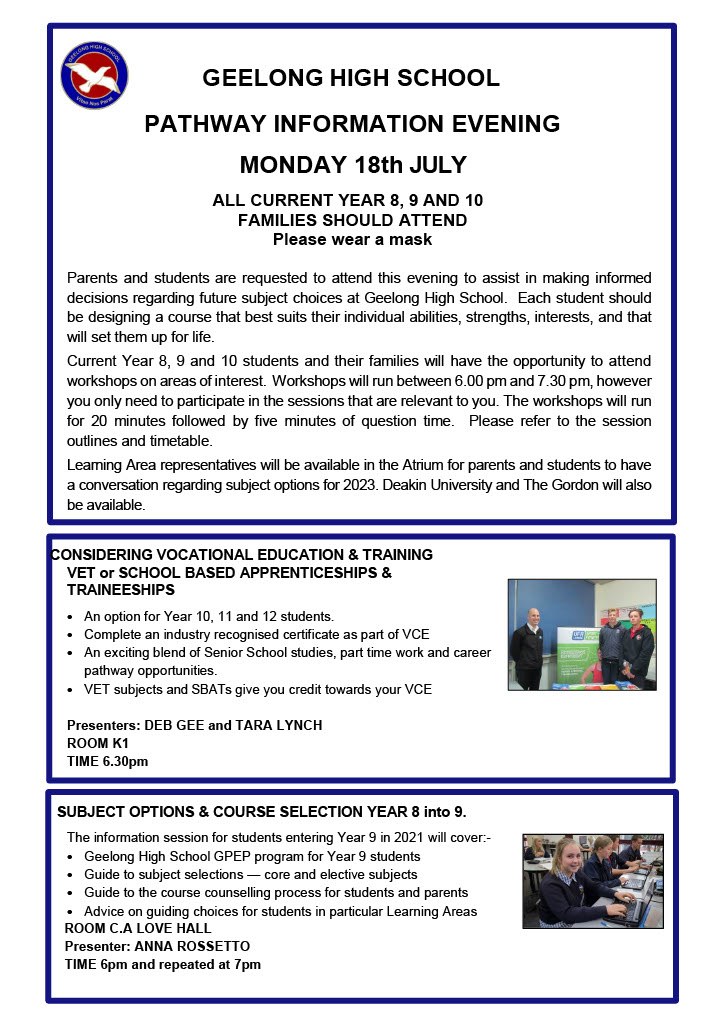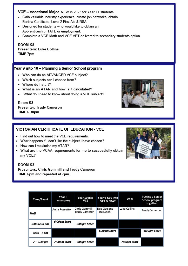 The most significant change for 2023 will be that the Victorian Certificate of Applied Learning (VCAL) will effectively be replaced by the VCE Vocational Major. Senior students and their parents have been provided with information about this change. Further information will be provided, for students considering this option, at the Pathways Information Evening (for current 8, 9 & 10 students and parents/carers) on Monday Night commencing at 6.00pm- see Compass Newsfeed for details.
