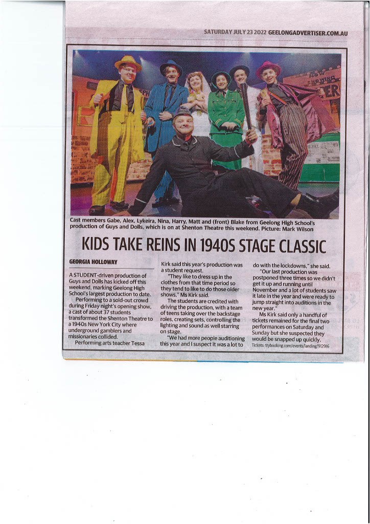 I hope you got to see this year’s school production of Guys and Dolls. To say I am proud of the students and staff would be a massive understatement. I thought the production was fantastic and judging by the responses of the audiences that is no exaggeration. The show was sold-out every night and both matinees. Every aspect of the show was thoroughly professional, from the sound, lighting, costumes and stage props, to the acting and singing of the performers and the seamless efficiency of the backstage crew. While it takes a team of people to produce an event such as this, one person – Tessa Kirk- stands out in terms of her effort, motivation, energy and professional execution of direction and production she brought to the show. Tessa has built wonderful relationships with the students motivating them to go well beyond what they themselves thought they were capable of achieving. I will be very surprised if a few of the students aren’t inspired to go on and pursue theatre studies in later years and possibly even as a career pathway.