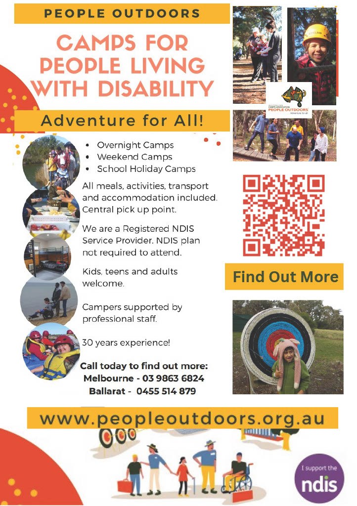 People Outdoors offer regular weekend and school holiday camps for kids (6-17 years) and adults (18+) with a disability, with departure points in both Melbourne and Ballarat.