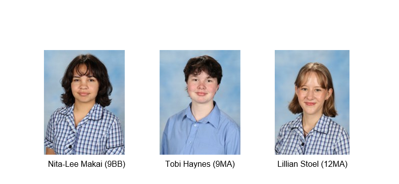 Congratulations to Nita-Lee Makai (9BB), Tobi Haynes (9MA) and Lillian Stoel (12MA) who have been accepted into the New Writers Collective program in 2024.