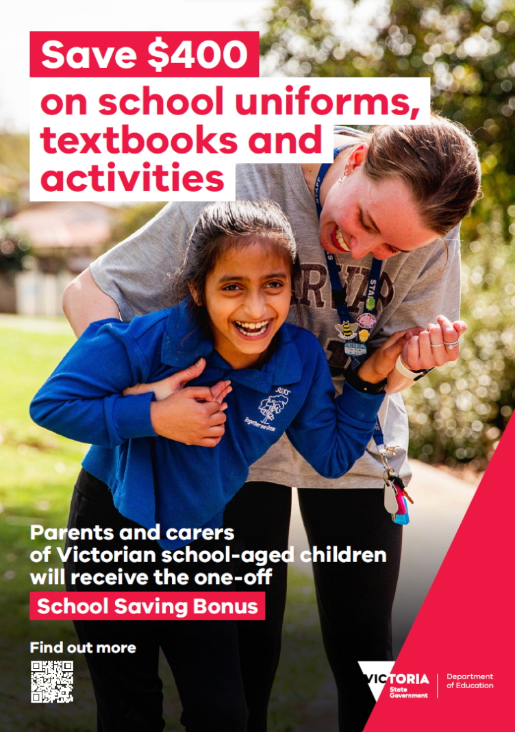 In Term 4, 2024, families with a child enrolled in a government school from Prep to Year 12 in 2025 will receive the one-off $400 School Saving Bonus.