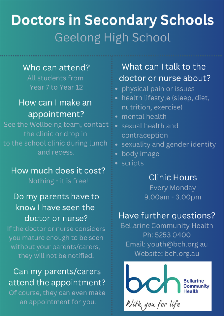 As we approach the end of the school year there is considerable planning underway regarding staffing and subjects for students. At this stage we only have 1 or 2 places for students in Year 10 and 11. I ask parents that if you are leaving Geelong High for any reason to let the school know as we do have a number of students wishing to enrol at all year levels.